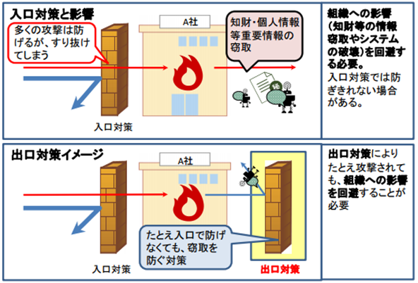 標的型謀報攻撃の影響を最小限に防ぐには、従来の攻撃を防ぐための入口対策と、たとえ組織の中に攻撃の一部が入り込まれたとしても、共通攻撃手法部分を止め、外部にいる攻撃者に情報を窃取されないための対策(出口対策)が必要です。